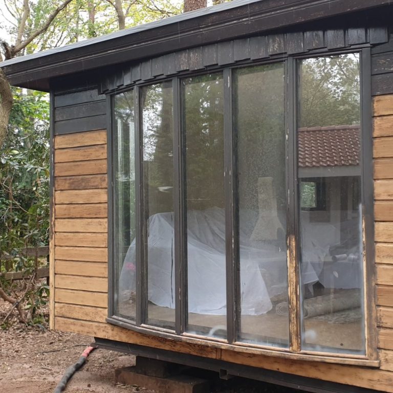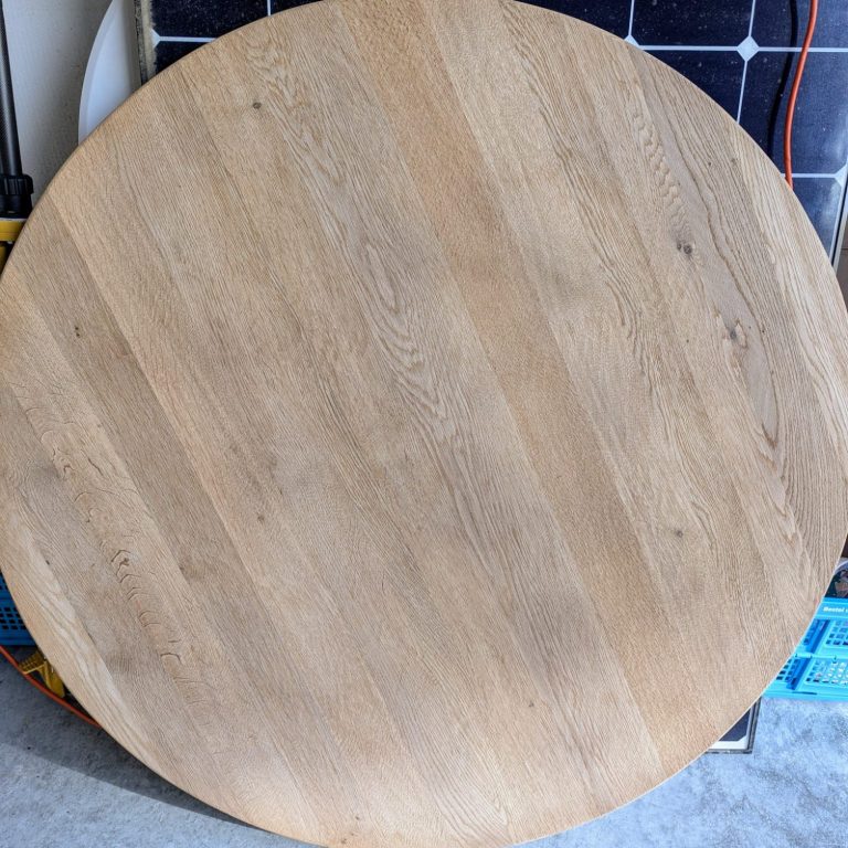 Bovenstaand voorbeeld van een houten tafelblad welke middels luchtgommen direct gereed is voor het aanbrengen van een nieuwe vernislaag.
